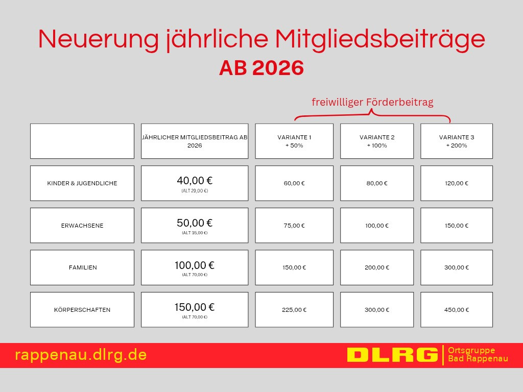 Ab dem 01.01.2026 erhöht die DLRG Ortsgruppe Bad Rappenau ihre Mitgliedsbeiträge. Details zu den neuen sowie bisherigen Beitragssätzen entnehmt ihr bitte der angehängten Tabelle. Die Beitragserhöhung wurde auf der Mitgliedsversammlung beschlossen.